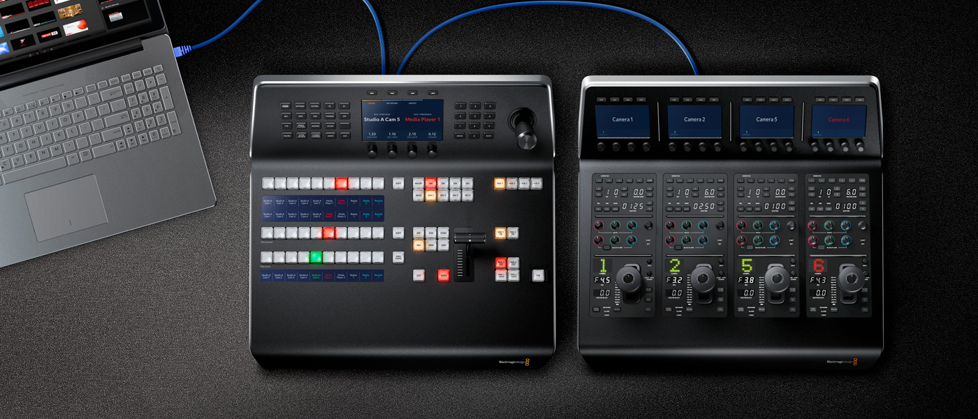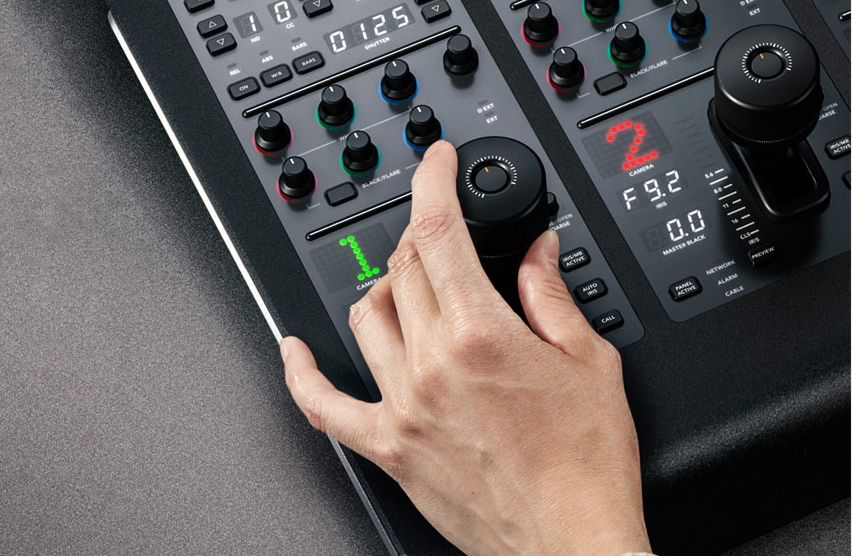 Независимое управление четырьмя камерами URSA Mini, URSA Broadcast, Blackmagic Studio и Micro Studio с единой панели. Возможность изменения параметров диафрагмы, выдержки затвора, баланса белого, чувствительности и уровня черного, а также настройка красного, зеленого и синего каналов.