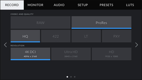 CinemaDNG RAW, CinemaDNG RAW 3:1, CinemaDNG RAW 4:1, ProRes 422 HQ QuickTime, ProRes 422 QuickTime, ProRes 422 LT QuickTime и ProRes 422 Proxy QuickTime