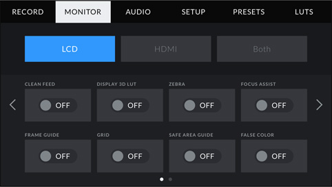 Задняя панель корпуса представляет собой 5-дюймовый сенсорный экран, который позволяет выполнять кадрирование и устанавливать фокус без помощи внешнего монитора или видоискателя. Blackmagic Pocket Cinema Camera 4K имеет такую же систему меню, как URSA Mini. Дисплей можно использовать для вывода служебных параметров и гистограммы, выделения контуров изображения и управления воспроизведением. Камера поддерживает работу с 3D
