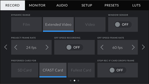 По одному слоту под карты CFast и SD/USH-II для записи в CinemaDNG Raw и ProRes. Кодек и кадровая частота зависят от выбранного накопителя.
