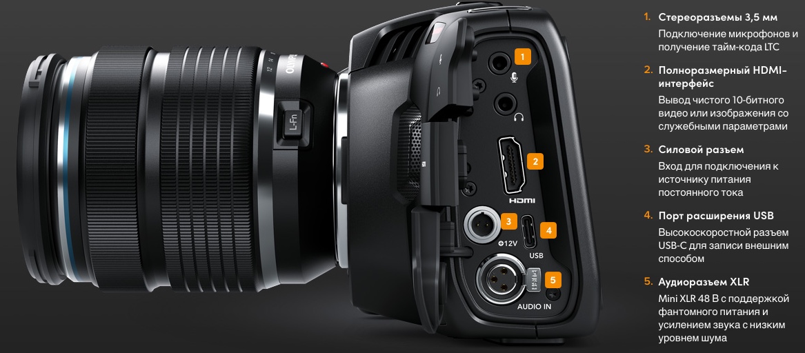 На Blackmagic Pocket Cinema Camera 4K есть разъем Mini XLR с фантомным питанием для подключения микрофонов |