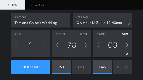 Автоматическое получение данных с электронных объективов, оснащенных креплением Micro Four Thirds. Автоматическая запись настроек камеры и дополнительных данных (проект, номер сцены, дубля и примечания).