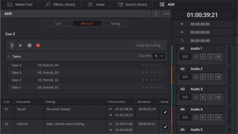 Инструменты Fairlight позволяют быстро и без труда создавать многослойные записи. На любом этапе воспроизведения можно выполнять перезапись отдельных фрагментов, а набор инструментов ADR обеспечивает повторное озвучивание диалогов.