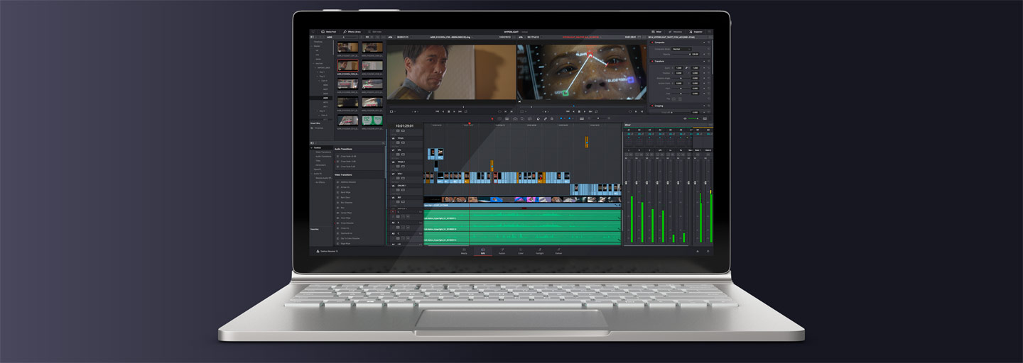 Встроенные инструменты Fusion для наложения визуальных эффектов и графики, функционал Fairlight для обработки звука и сотни улучшений для увеличения производительности