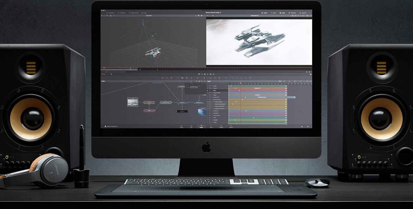 DaVinci Resolve 15 включает в себя программный пакет Fusion для наложения графики и визуальных эффектов в трехмерном пространстве. Страница Fusion содержит более 250 инструментов для композитинга, векторного рисования, кеинга, ротоскопирования, анимирования текста, трекинга, стабилизации изображения и добавления частиц, а благодаря поддержке технологии Apple Metal и архитектуры CUDA производительность стала еще выше. В последней версии существенно расширен функционал Fairlight: появились средства ADR, прокрутка аудио и видео, нормализация и панорамирование звука, база данных для библиотеки и встроенные
