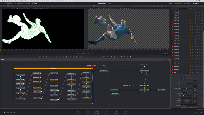 Fusion позволяет использовать сплайны и кривые Безье для отделения людей или предметов от остальных элементов в кадре. Данные плоскостного трекинга дают возможность обойтись без ручного анимирования таких операций, как масштабирование, вращение, позиционирование, движение и изменение перспективы.