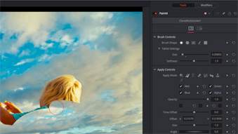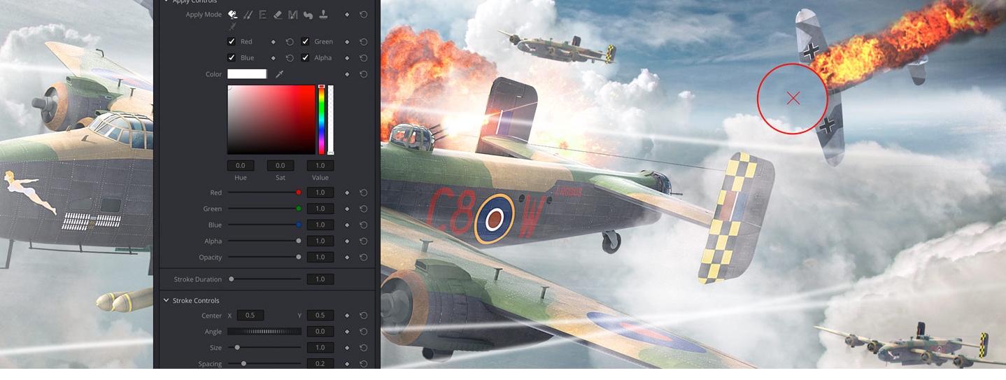 Fusion имеет независимые инструменты рисования, позволяющие настраивать и изменять такие параметры, как стиль кисти, режим наложения и форма мазка. С помощью этой функции из кадра можно быстро удалить провода, детали съемочного оборудования и другие ненужные элементы — достаточно скопировать одну область на другую, закрасить изображение или добавить новые предметы.