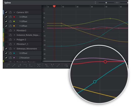 Анимирование по ключевым кадрам требует мощных инструментов обработки. Для этого во Fusion используются линейный способ, кривые Безье и сплайны, которые позволяют прибегать к закольцовке, инверсии, перемещению и другим приемам для создания самых разных эффектов.