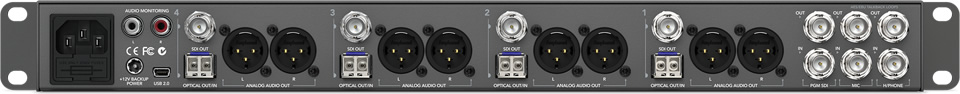Один 10-битный программный вход для сигнала видеомикшера, с возможностью переключения между SD/HD/Ultra HD 4K, поддержкой индикации состояния и 16-канального встроенного звука