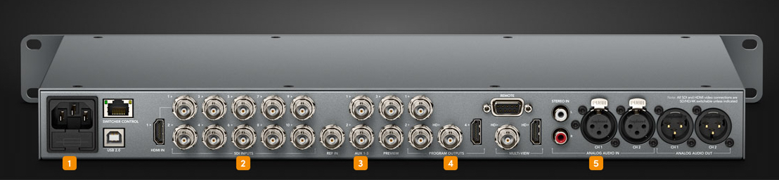 Микшеры ATEM имеют входы 6G-SDI и HDMI, которые позволяют работать с форматами SD, HD и Ultra HD вплоть до 2160p/30. На ATEM Broadcast Studio 4K предусмотрен интерфейс 12G-SDI с 20 разъемами для видео в высоком и сверхвысоком разрешении до 2160p/60. Все входы поддерживают встроенный звук и кадровую синхронизацию, поэтому можно использовать технику без функции genlock (например, ноутбук) для вывода презентаций PowerPoint™ в режиме реального времени. ATEM также имеет два симметричных аудиовхода XLR для подключения профессионального оборудования и разъем