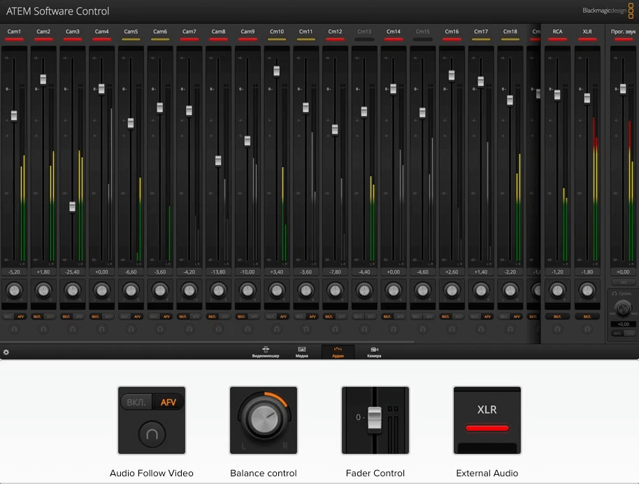 Все модели ATEM имеют встроенный звуковой блок, мощные возможности которого позволяют работать с сигналами разных каналов. Можно добавлять аудио с камеры к видео, поступающему на входы HDMI и SDI, а также использовать внешнюю дорожку с аналогового аудиовхода XLR или