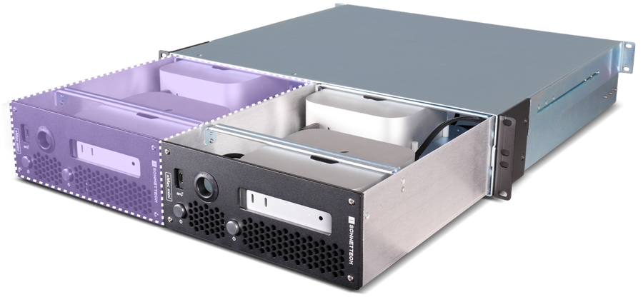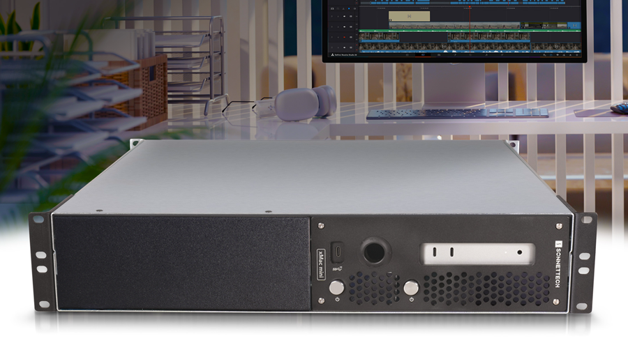 xMac mini (2024+) — это корпус высотой 2U для монтажа в стойку, в котором размещается модуль xMac mini (2024+) для подключения компьютеров Mac mini и пустой отсек расширения, в который вы можете установить любой модуль расширения Sonnet.