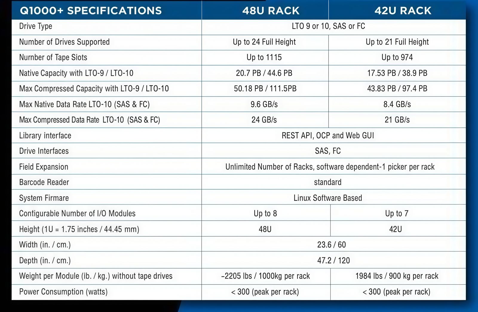 Q1000+ доступна в конфигурациях 42U и 48U и поддерживает ленточные накопители LTO-9 и LTO-10. Каждая стойка обеспечивает до 44.6 PB нативной емкости хранения или до 111.5 PB с компрессией. Система разработана с учетом масштабируемости за счет объединения нескольких стоек в единую библиотеку, что позволяет расширять ее до эксабайтных масштабов.