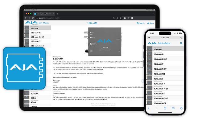 Информация о полной линейке преобразователей AJA, маршрутизаторов, синхронизаторов кадров и карт openGear доступна в приложении