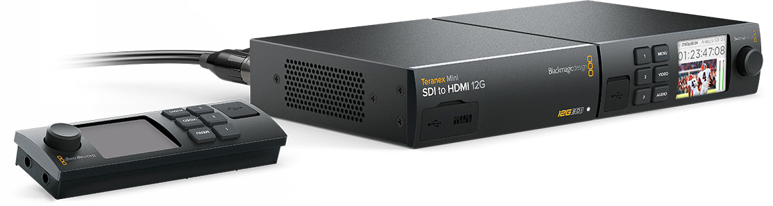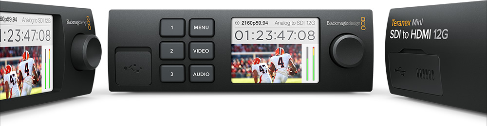 Teranex Mini — новое поколение конвертеров с интерфейсом 12G-SDI и поддержкой всех разновидностей SD, HD и Ultra HD вплоть до 2160p60. Модели этой линейки оснащены встроенным блоком питания переменного тока, аналоговыми XLR- и цифровыми AES/EBU-аудиоразъемами профессионального класса, а также портом Ethernet для удаленного контроля и поддержки PoE. Съемная передняя панель с цветным дисплеем и органами управления позволяет вести мониторинг видео и быстро изменять настройки. Полностью сохранив широкий функционал традиционных