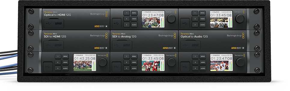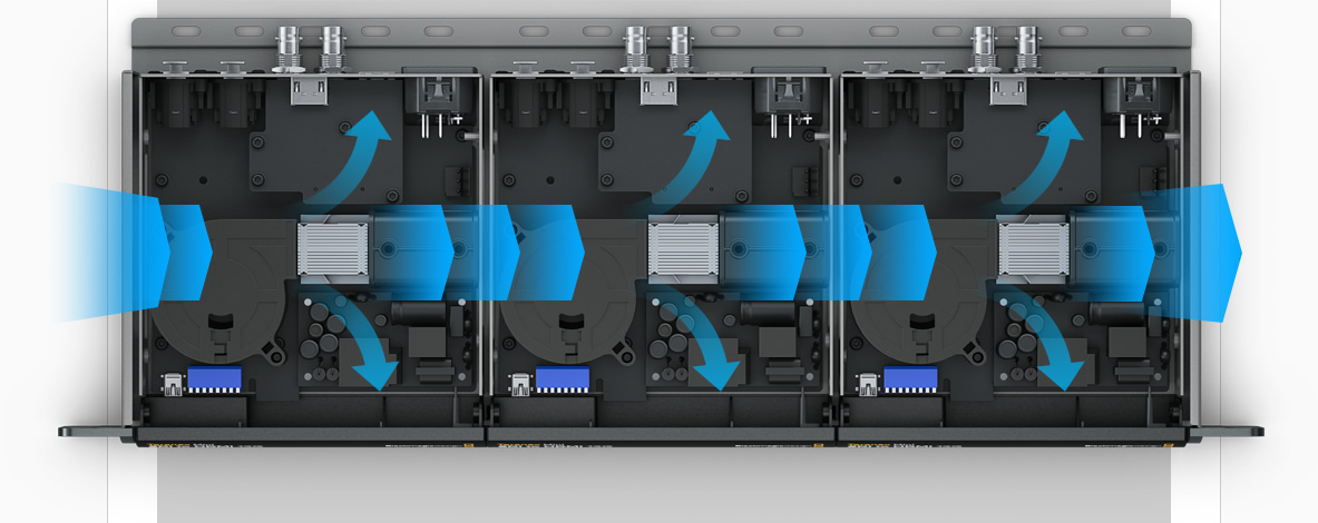 Размер Teranex Mini дает возможность размещать в стойке три, шесть и девять конвертеров, которые будут занимать одно, два и три места соответственно. Каждый из них оснащен вентилятором с переменной скоростью вращения, что обеспечивает оптимальную циркуляцию воздуха при установке устройств рядом друг с другом. В случае отказа вентилятора в одном Teranex Mini будет увеличена мощность охлаждения в другом, чтобы не допустить перегрева. Благодаря малым размерам и легкому весу конвертеры можно устанавливать в любом удобном месте!