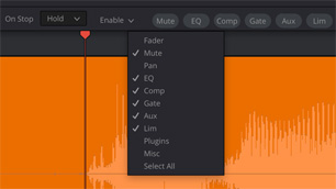Полная автоматизацияСохранение шаблона для любых параметров, в том числе плагиновДля полной автоматизации обработки предусмотрена поддержка режимов подгонки, замедленного воспроизведения, предварительного просмотра и заполнения. Дополнительно к таким стандартным параметрам, как Pan, Level и EQ, на странице с инструментами Fairlight доступна автономная корректировка настроек во время вывода материала. Кроме того, можно запрограммировать изменения при использовании программных средств VST. |