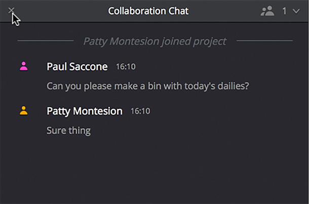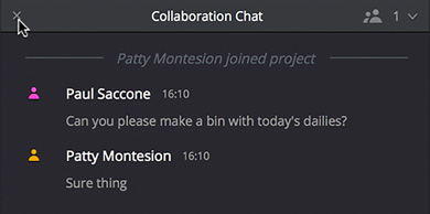Встроенный чат Интегрированный сервис обмена сообщениями позволяет общаться с другими членами команды непосредственно из приложения DaVinci Resolve. |
