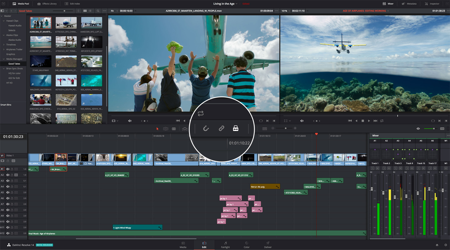 DaVinci Resolve 15 задает новые стандарты постпроизводства. Система позволяет одновременно с грейдингом выполнять монтаж видео и звука в рамках одного проекта. Теперь перед цветокоррекцией и созданием аудиодорожки не нужно сводить материал и ждать конечной копии на основе EDL. Все три процесса могут быть параллельными, а значит, у колористов и редакторов будет больше времени на поиск творческих решений!