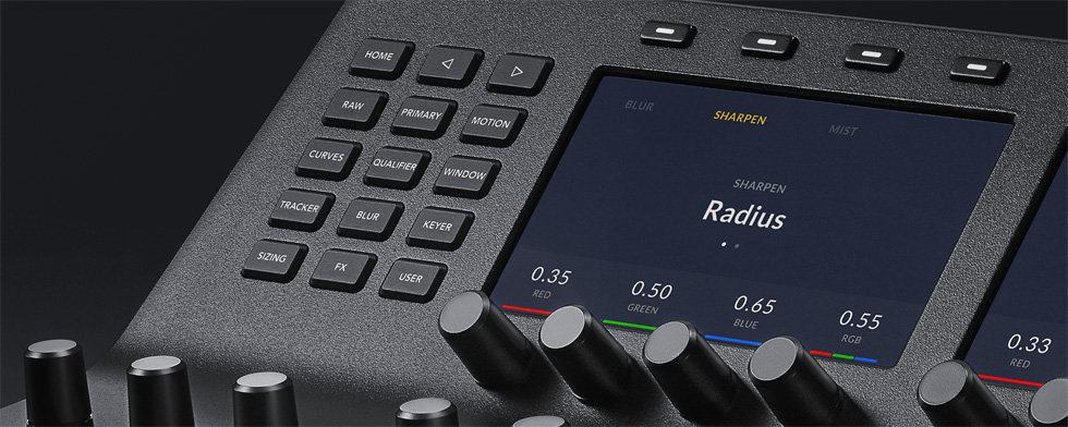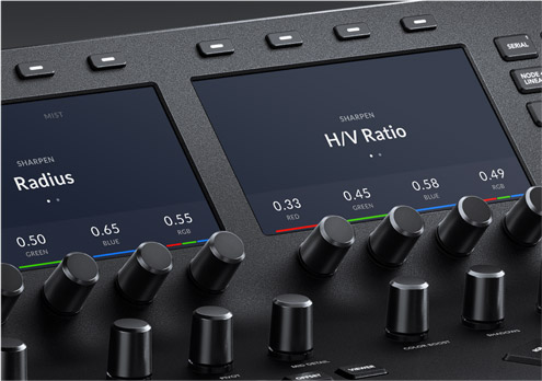 DaVinci Resolve Advanced Panel и DaVinci Resolve Mini Panel имеют яркие полноцветные дисплеи, которые позволяют полностью контролировать процесс цветокоррекции. На них выводятся меню для многофункциональных кнопок и ручек, а также значения устанавливаемых параметров. Благодаря автоматическому обновлению на экране отображаются опции для текущего набора инструментов, что значительно ускоряет работу колориста.
