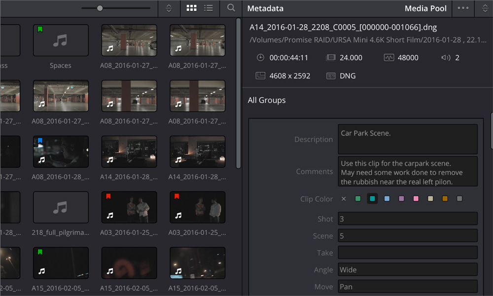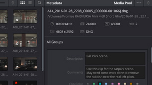 В дополнение к автоматическому импорту метаданных из файла предусмотрена поддержка собственных ключевых слов и тегов. По ним, а также по типу камеры и любой другой информации, легко выполнить сортировку материала в папках. Вместо названий клипов можно использовать обозначения сцен, кадров и дублей, что избавляет от необходимости присваивать новые имена.