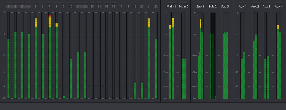 Страница инструментов Fairlight в DaVinci Resolve 15 содержит индикаторы любых источников звука в проекте. Кроме того, можно измерить уровень на выходах вспомогательных и дополнительных шин, а также отобразить фазу и значение громкости.
