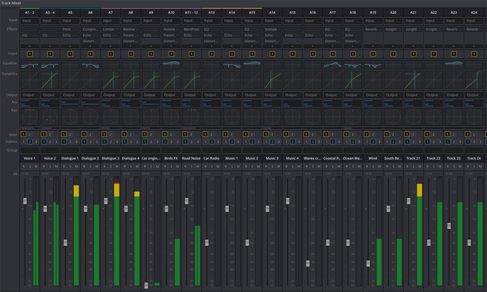 Набор инструментов Fairlight — это полноценная цифровая рабочая станция с профессиональным микшером. Она позволяет автоматизировать задачи, вести мониторинг и отображать индикаторы уровня, поддерживает редактирование с точностью до отдельного сэмпла и базу данных для звуковой библиотеки, а также имеет инструменты речевого озвучивания и плагины. Кроме того, можно выполнять сведение нескольких дорожек в один файл и создавать