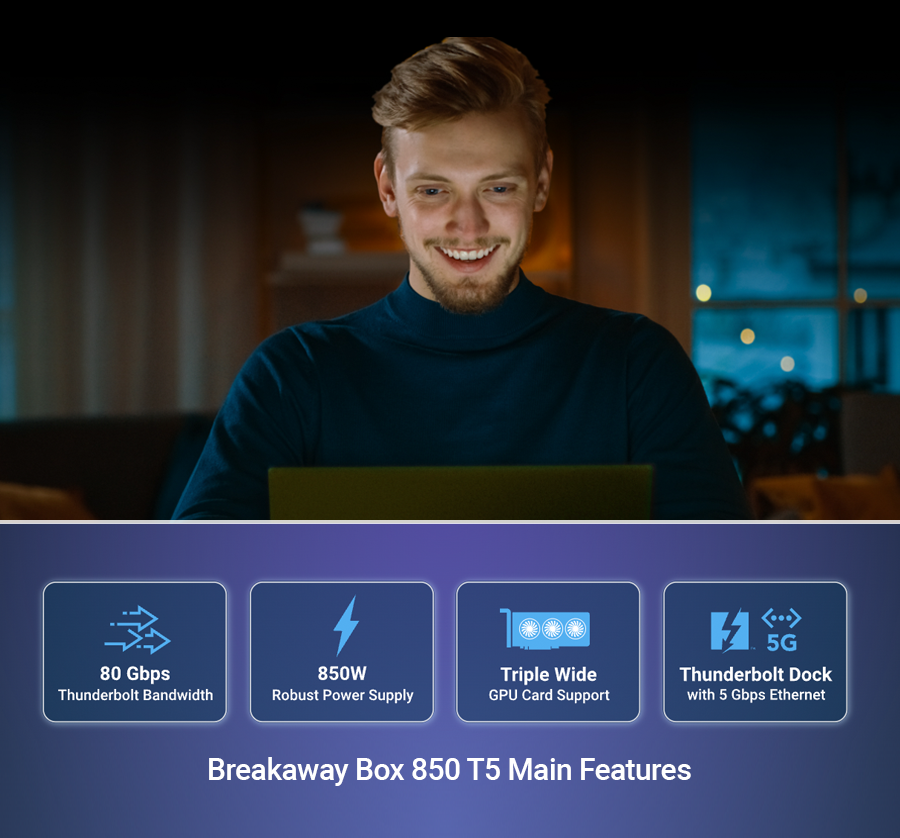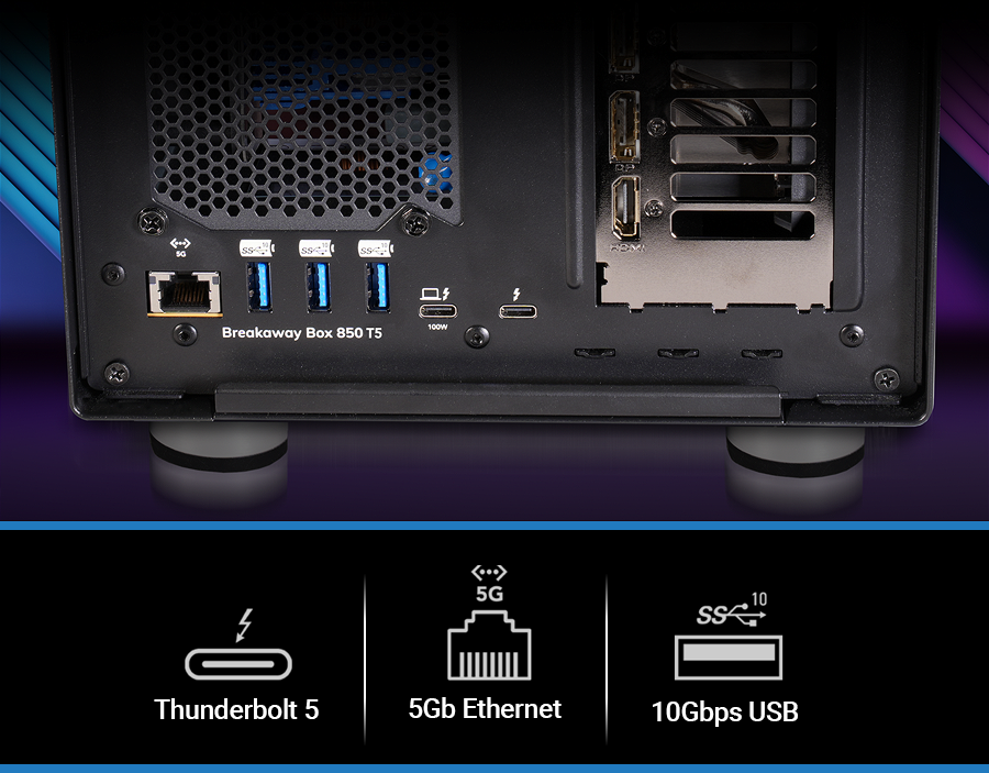 Breakaway Box 850 T5 обладает всеми возможностями, которые вы ожидаете от новейшего корпуса для GPU. Подключениt к компьютеру всего по одному кабелю Thunderbolt даст серьезный скачок в вычислительной мощности за счет внешней видеокарты, а дополнительный порты на задней части бокса позволят подключить дополнительную требовательную периферию.