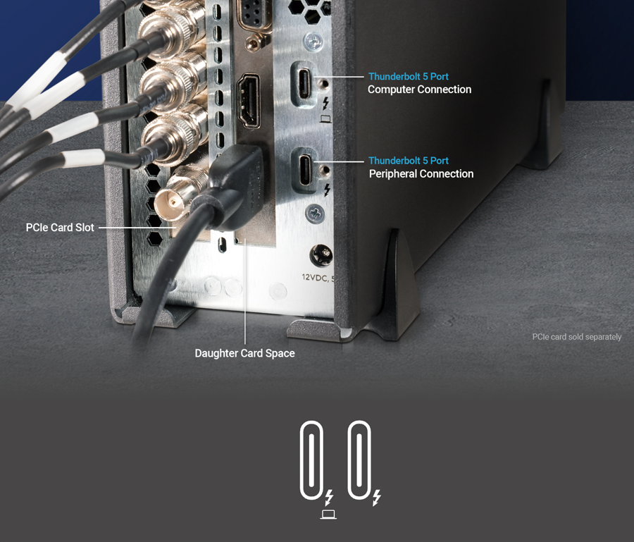 Sonnet Echo SE I T5 оснащён слотом x8 PCIe 4.0 и поддерживает карты PCIe одинарной или двойной ширины. Двойной ширины? Примерами служат профессиональные видео- и аудиокарты, такие как Blackmagic Design DeckLink 8K Pro G2, занимающие два слота, или платы с подключенными дочерними платами, которые используют дополнительное пространство рядом с основными платами.