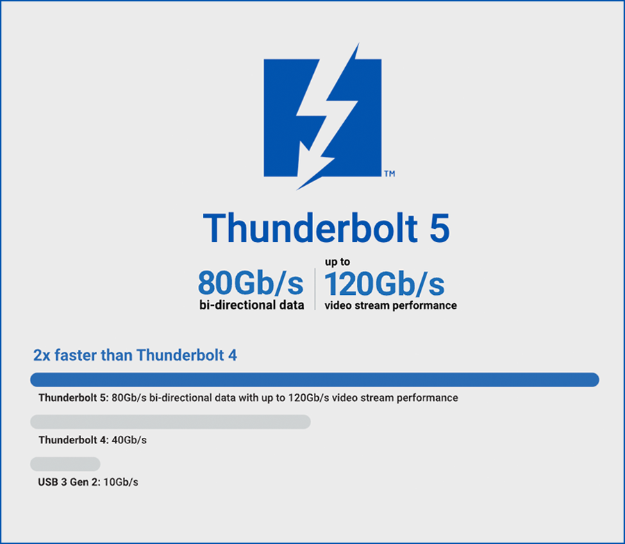 Дополнительный порт поддерживает периферийные устройства Thunderbolt 5, 4 и 3; вы даже можете подключить пять дополнительных устройств Thunderbolt с автономным питанием, последовательно соединив их в цепочку. - Поддержка периферийных устройств USB со скоростью 80 Гбит/с, 40 Гбит/с, 20 Гбит/с и 10 Гбит/с