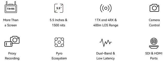 Pyro 5 оснащен 5,5" экраном высокой яркости (1500 нит), что позволяет легко настраивать основные параметры картинки даже в сложных условиях освещения. Поддерживая работу в двух диапазонах 2.4G и 5G, Pyro 5 обеспечивает стабильность беспроводного сигнала и скорость отклика. А со сквозными выходами HDMI и SDI этот Pyro 5 легко интегрируется в различные производственные среды.