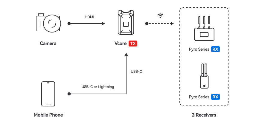 Беспроводная передача сигнала с Vcore доступна на смартфоны и планшеты на базе Android или iOS, а также на приемники серии Pyro, предоставляя мощные возможности мониторинга сигнала сразу на нескольких устройствах. Сигнал передается на частоте 5 ГГц на расстояние до 100м в прямой видимости с задержкой около 65 мс.